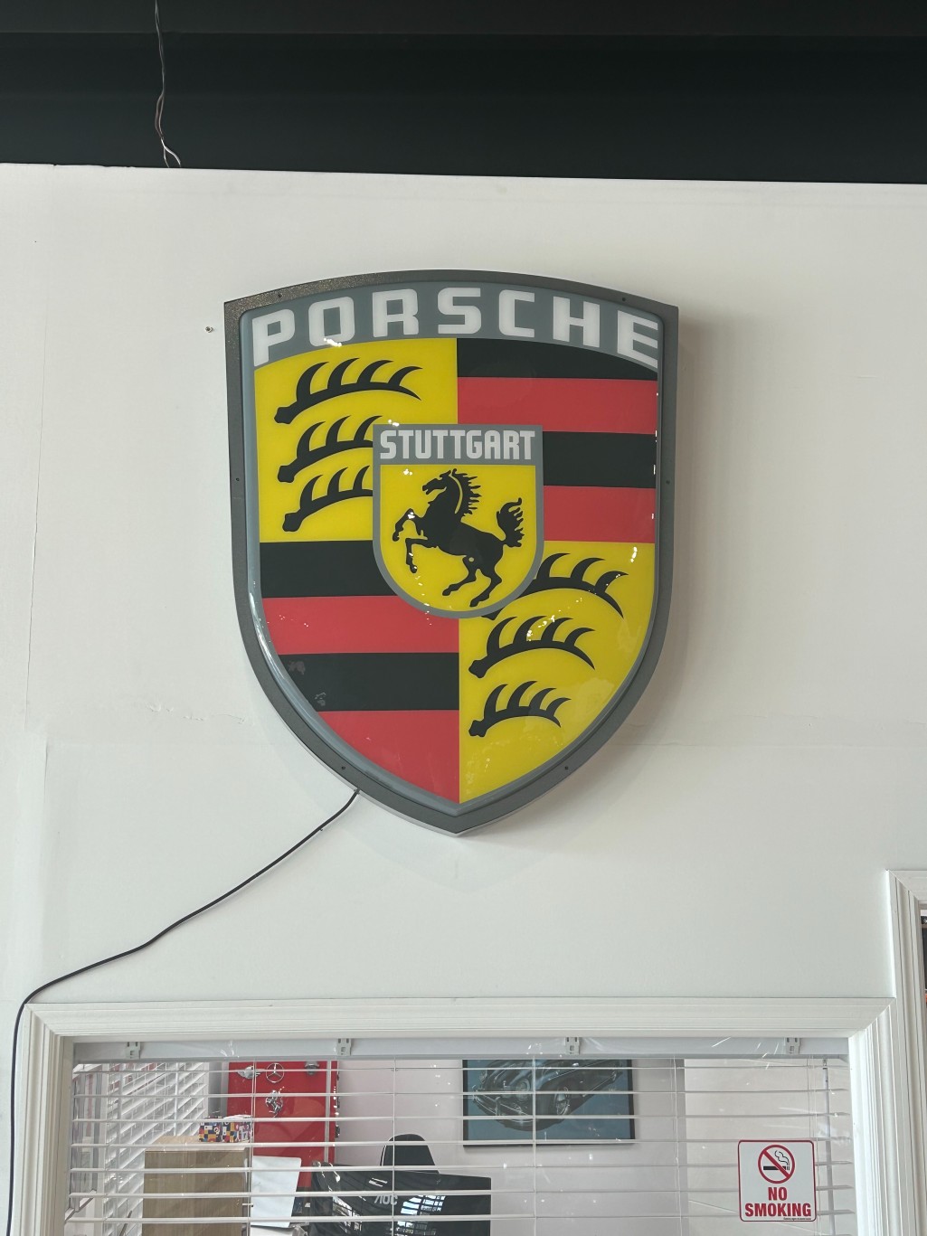 A striking illuminated Porsche dealer crest wall piece, designed to showcase the brand’s iconic emblem with bold presence. This unique display features built-in lighting, adding depth and vibrance — perfect for a showroom, garage, or collector’s space.