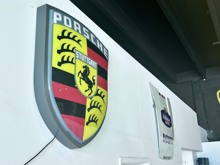 A striking illuminated Porsche dealer crest wall piece, designed to showcase the brand’s iconic emblem with bold presence. This unique display features built-in lighting, adding depth and vibrance — perfect for a showroom, garage, or collector’s space.