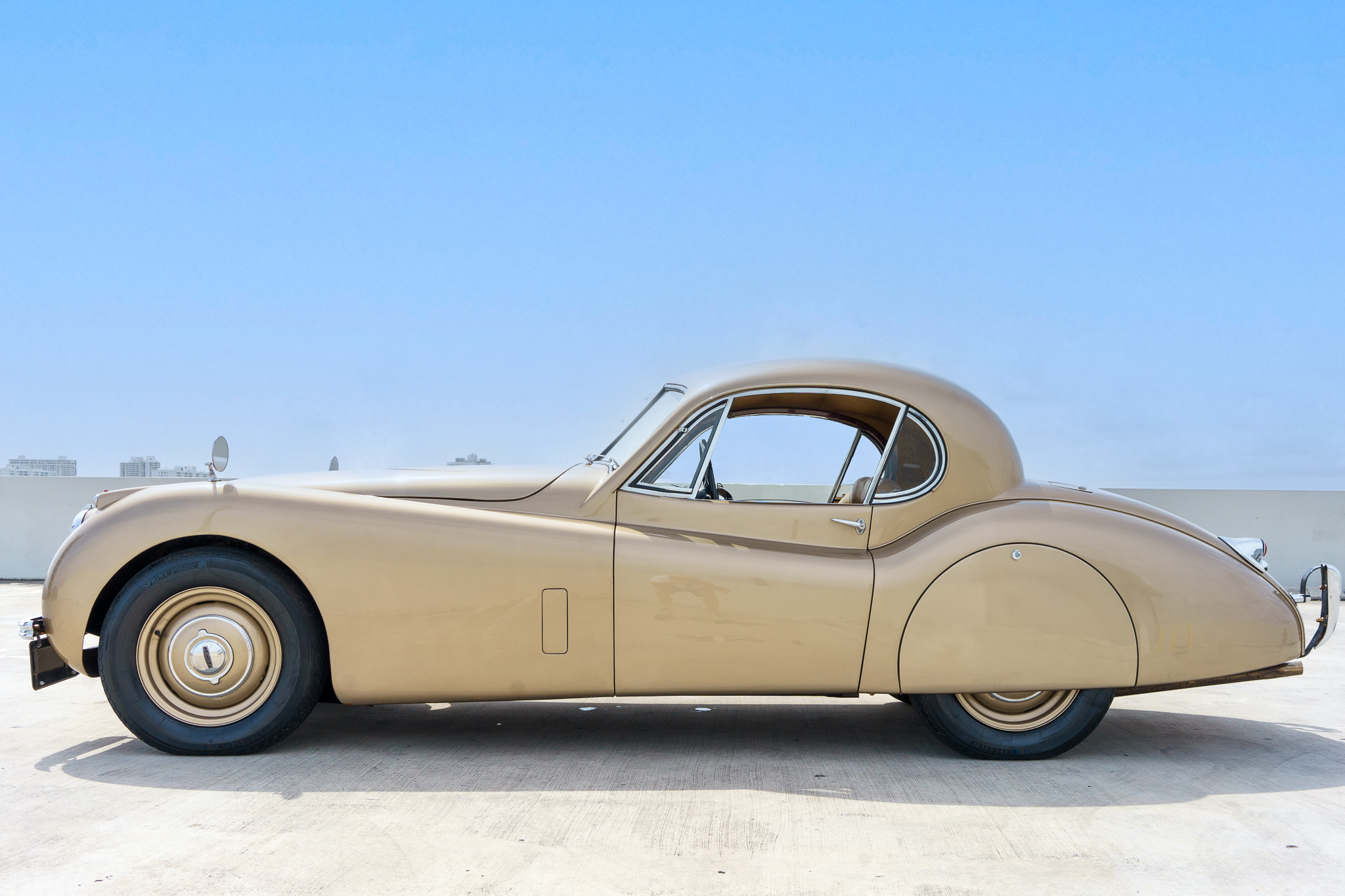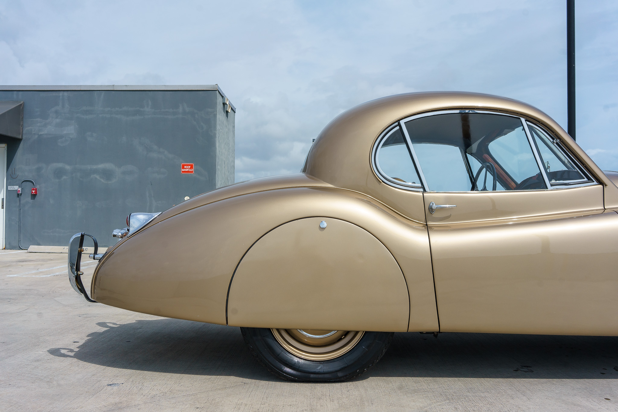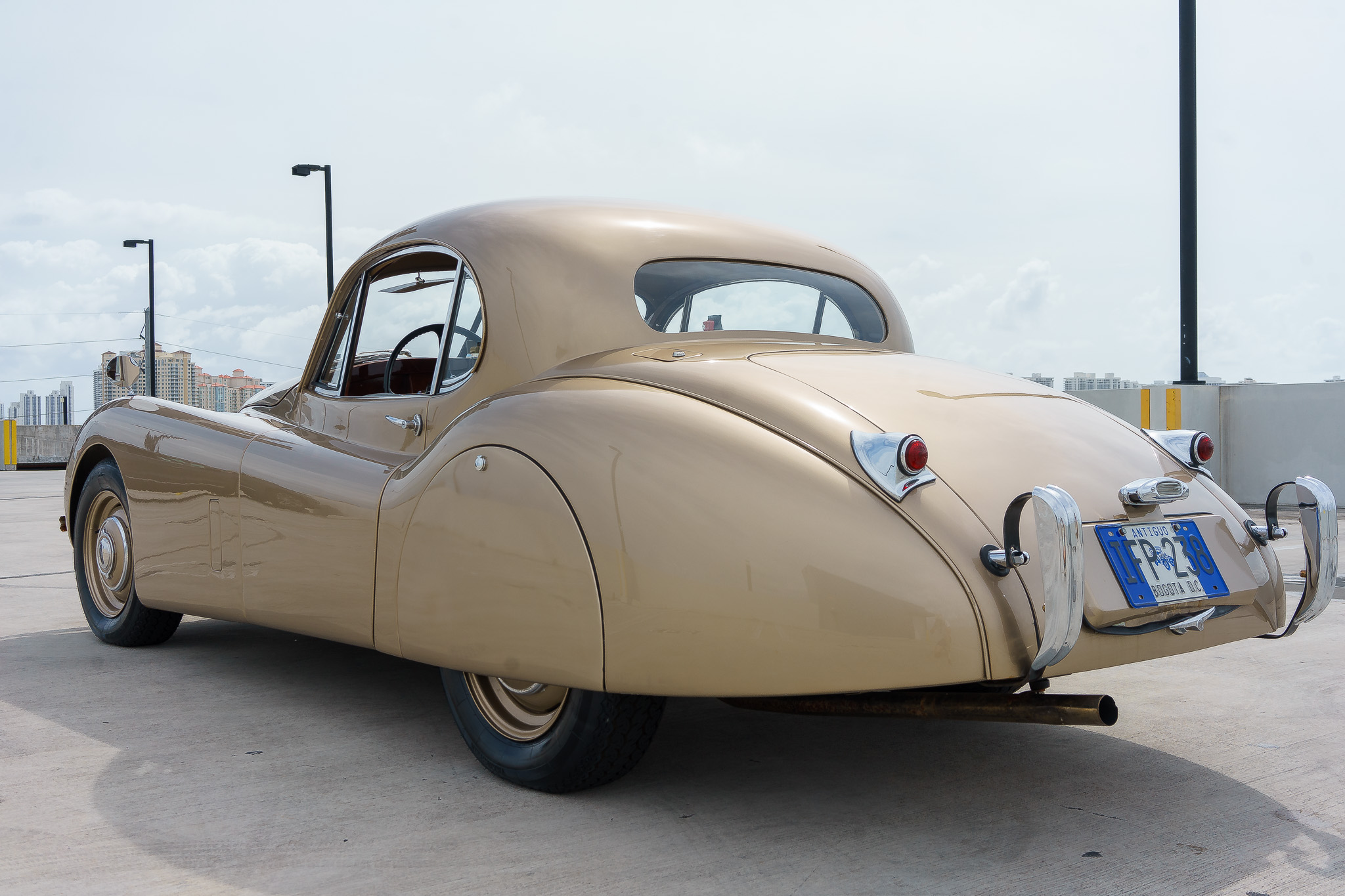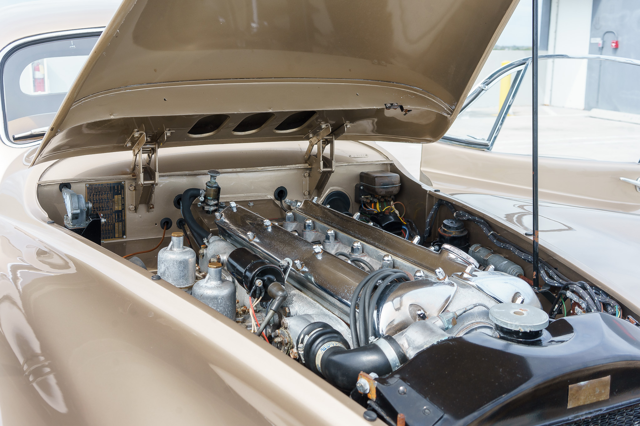 This 1955 Jaguar XK120 Fixed Head Coupe is powered by a 3.4‑liter straight‑six producing up to 220 horsepower paired with a four‑speed manual transmission. Finished in gold over tan leather‑trimmed upholstery with finely detailed stitching and burr walnut veneers, the car features a lightweight aluminum body with an aerodynamic silhouette, a dual exhaust system, independent front suspension with torsion bars, classic wire wheels, a functional dashboard and the iconic long bonnet.