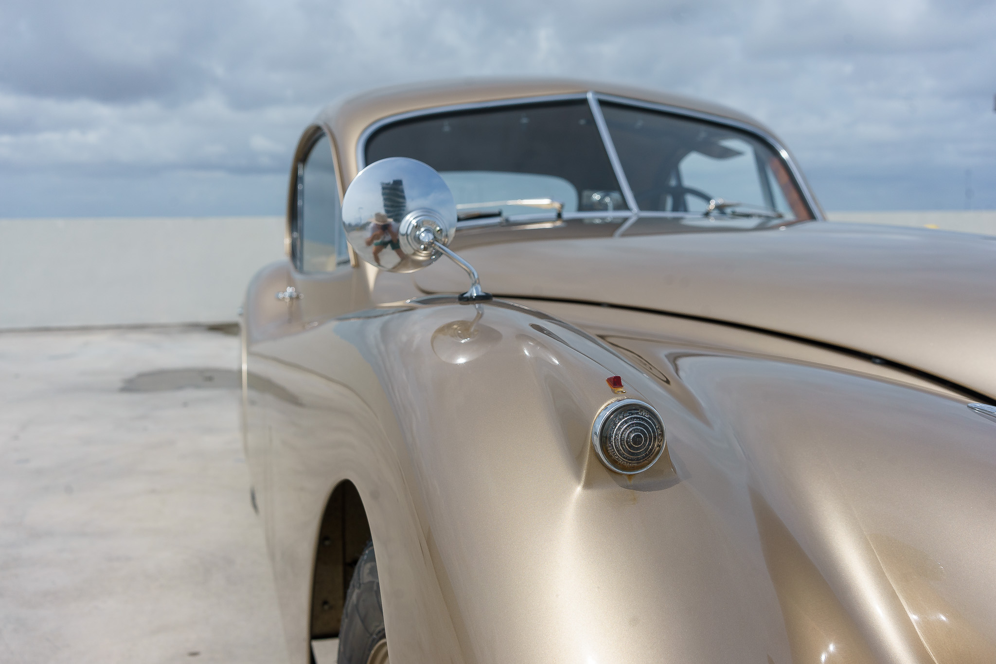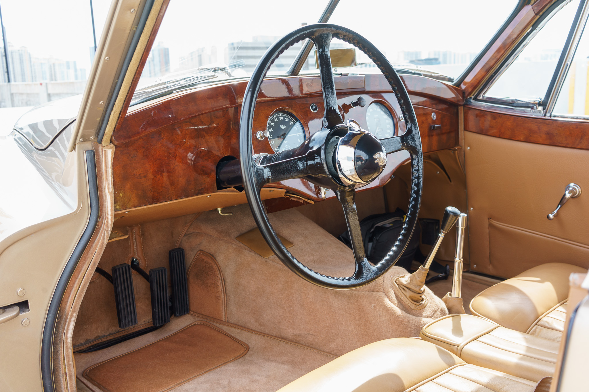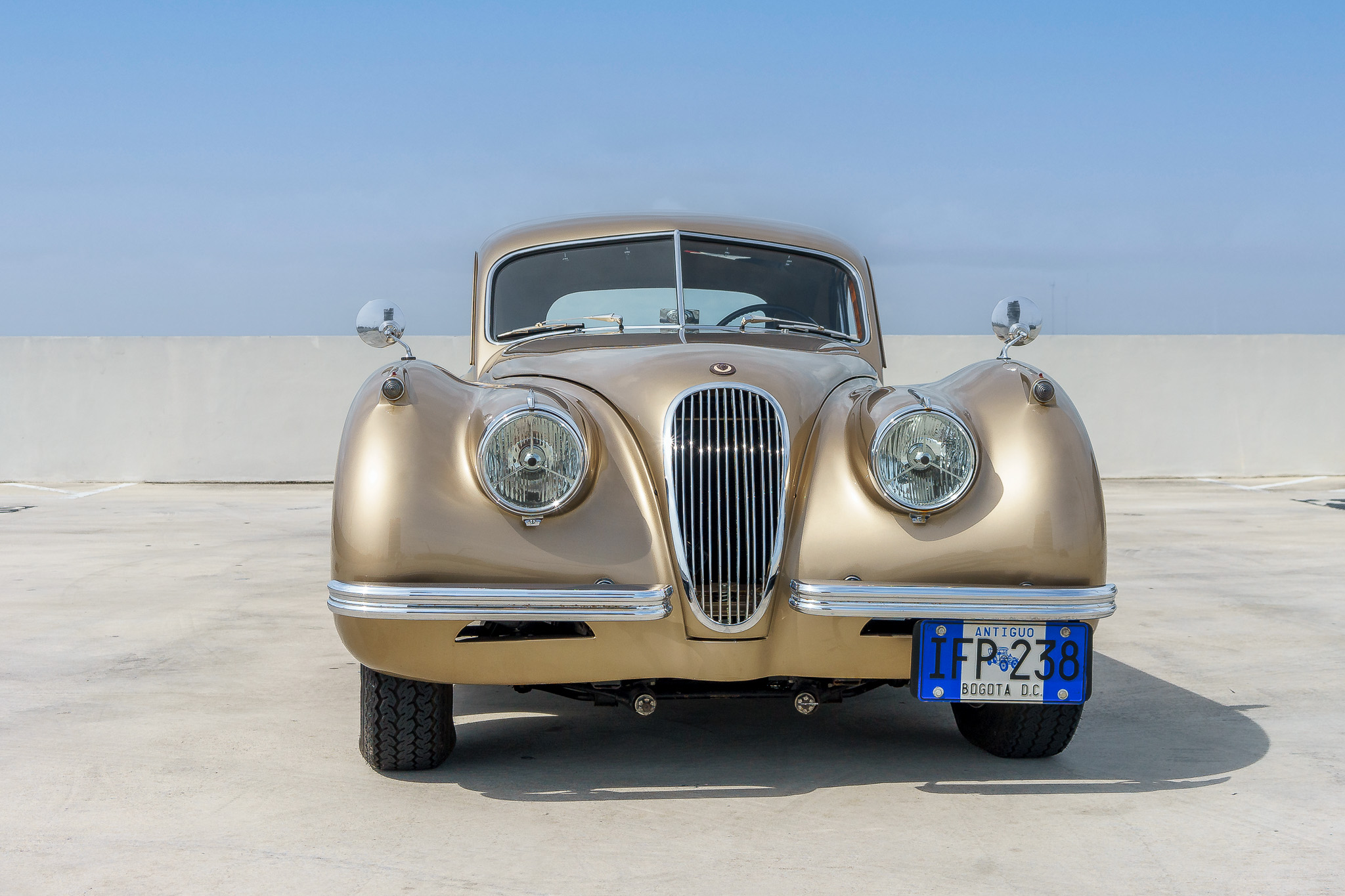 This 1955 Jaguar XK120 Fixed Head Coupe is powered by a 3.4‑liter straight‑six producing up to 220 horsepower paired with a four‑speed manual transmission. Finished in gold over tan leather‑trimmed upholstery with finely detailed stitching and burr walnut veneers, the car features a lightweight aluminum body with an aerodynamic silhouette, a dual exhaust system, independent front suspension with torsion bars, classic wire wheels, a functional dashboard and the iconic long bonnet.