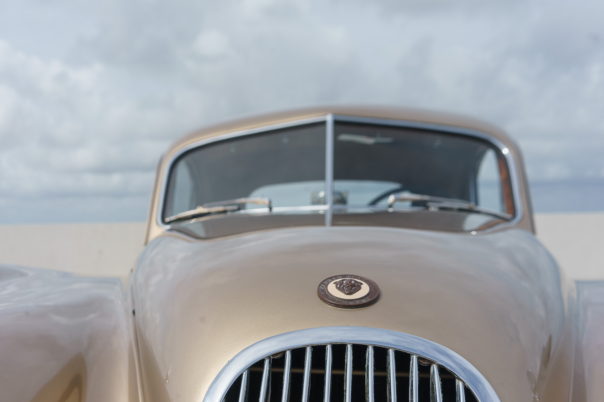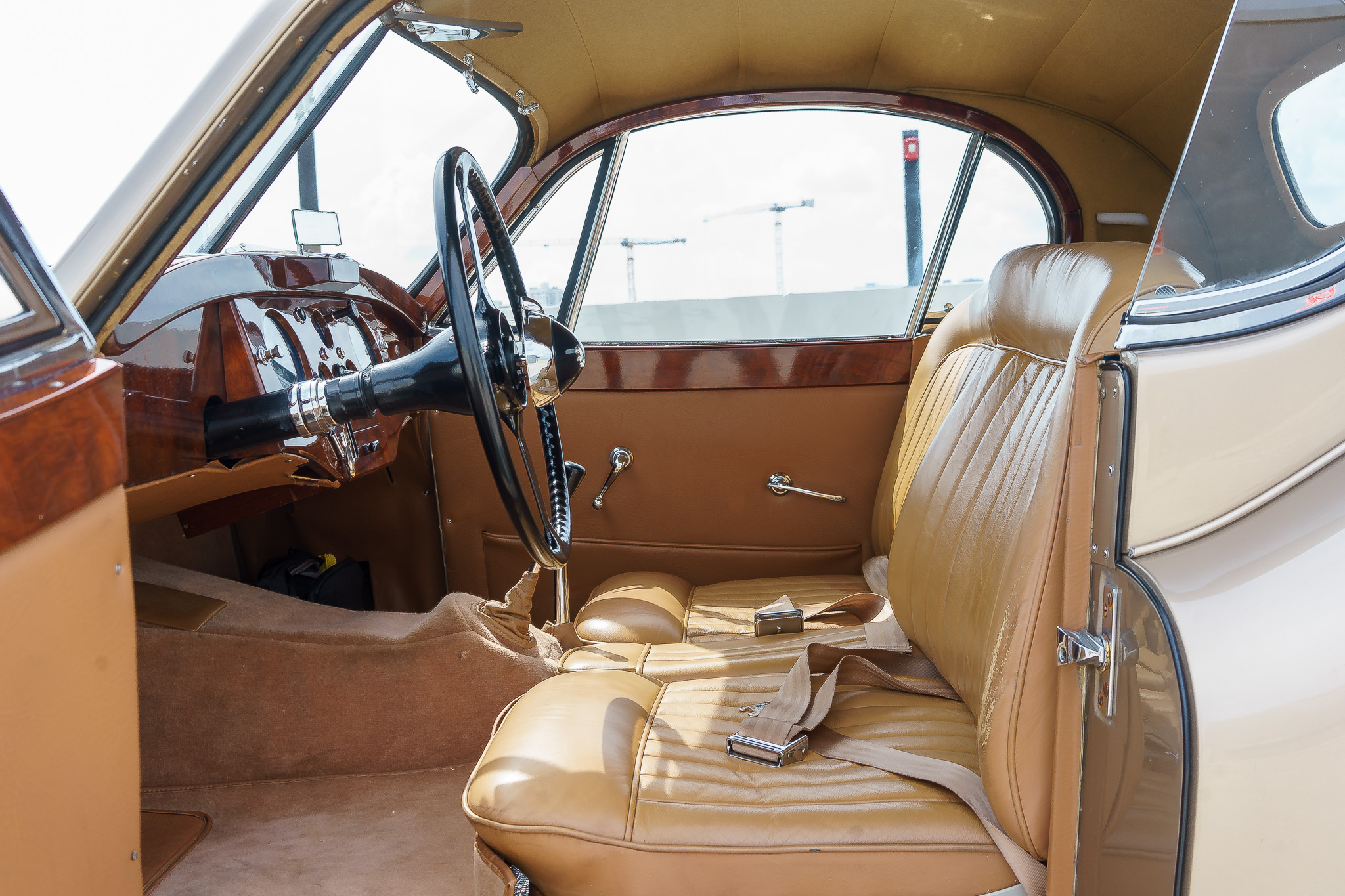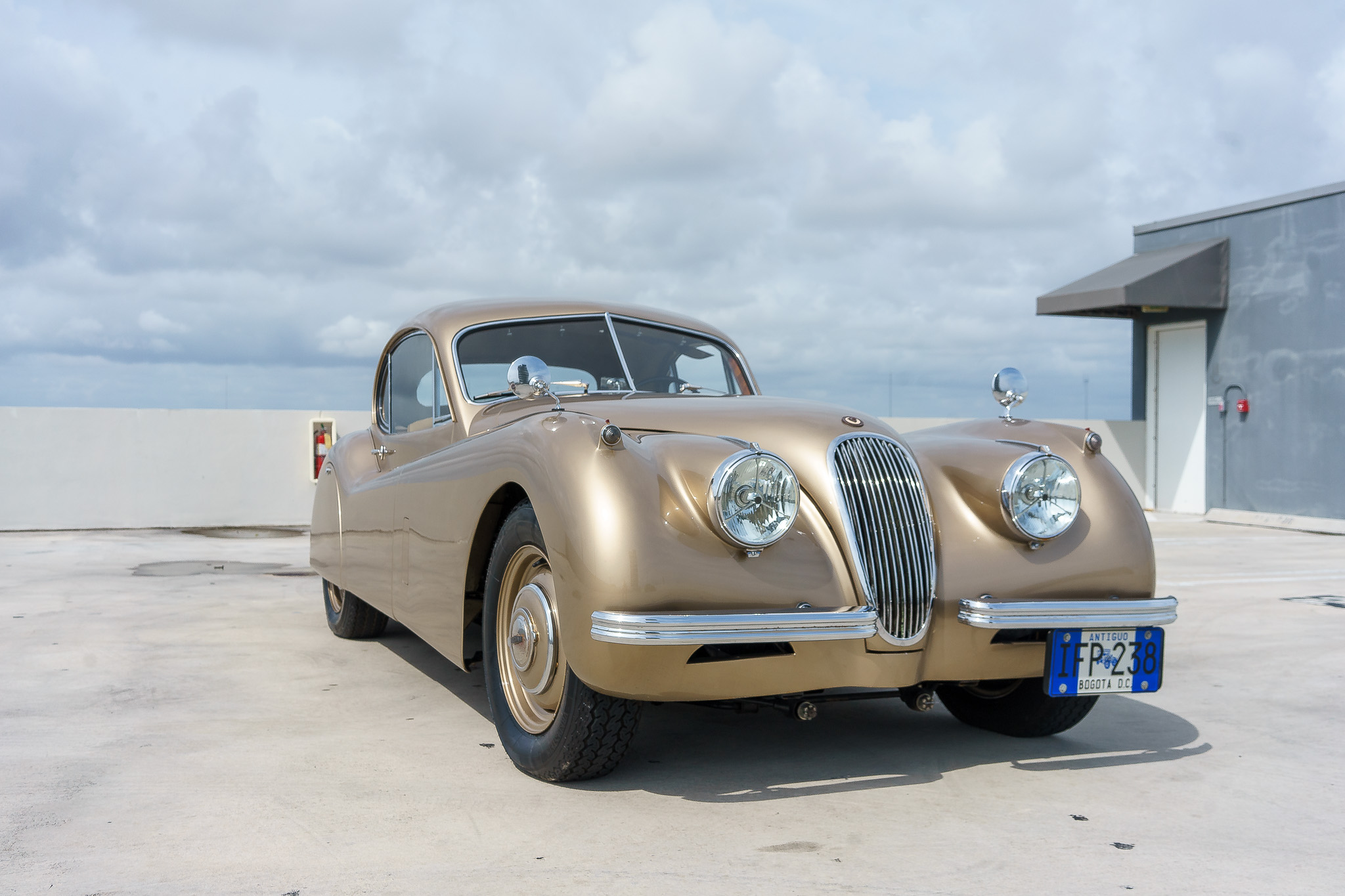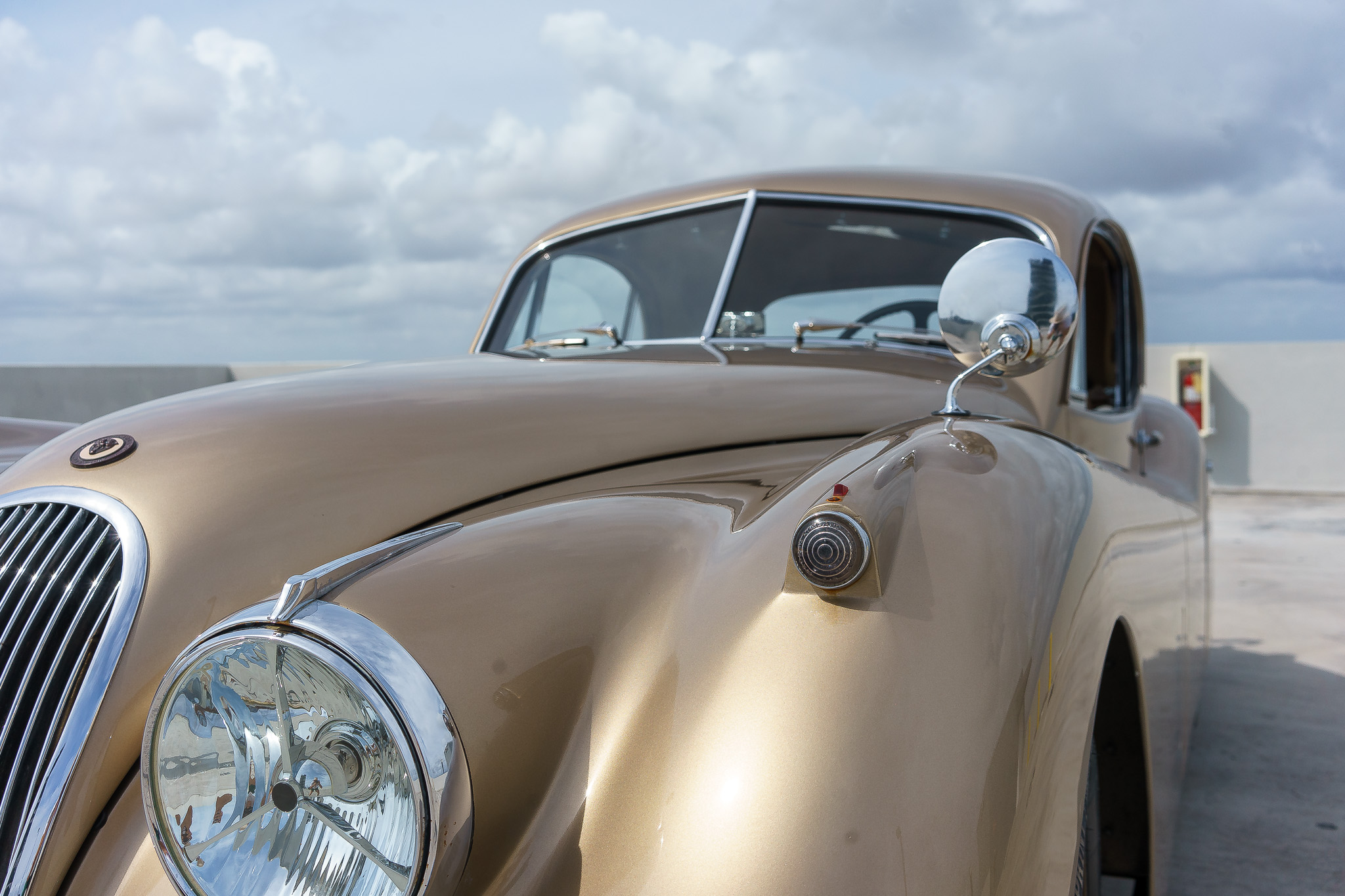 This 1955 Jaguar XK120 Fixed Head Coupe is powered by a 3.4‑liter straight‑six producing up to 220 horsepower paired with a four‑speed manual transmission. Finished in gold over tan leather‑trimmed upholstery with finely detailed stitching and burr walnut veneers, the car features a lightweight aluminum body with an aerodynamic silhouette, a dual exhaust system, independent front suspension with torsion bars, classic wire wheels, a functional dashboard and the iconic long bonnet.