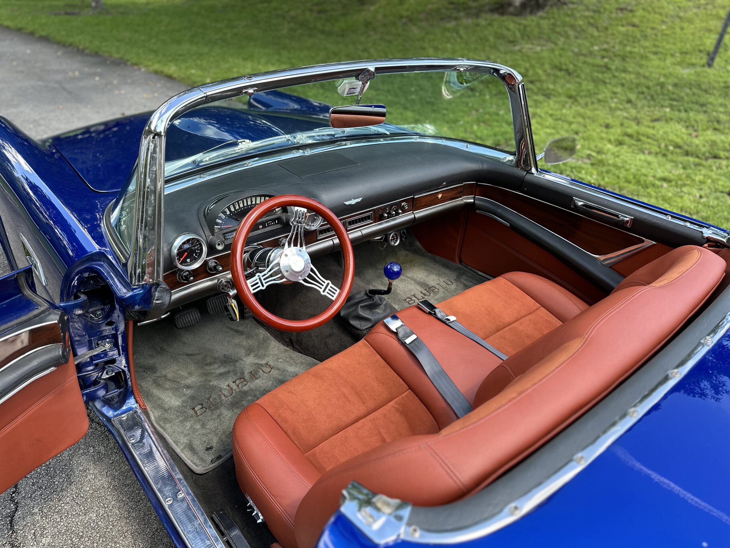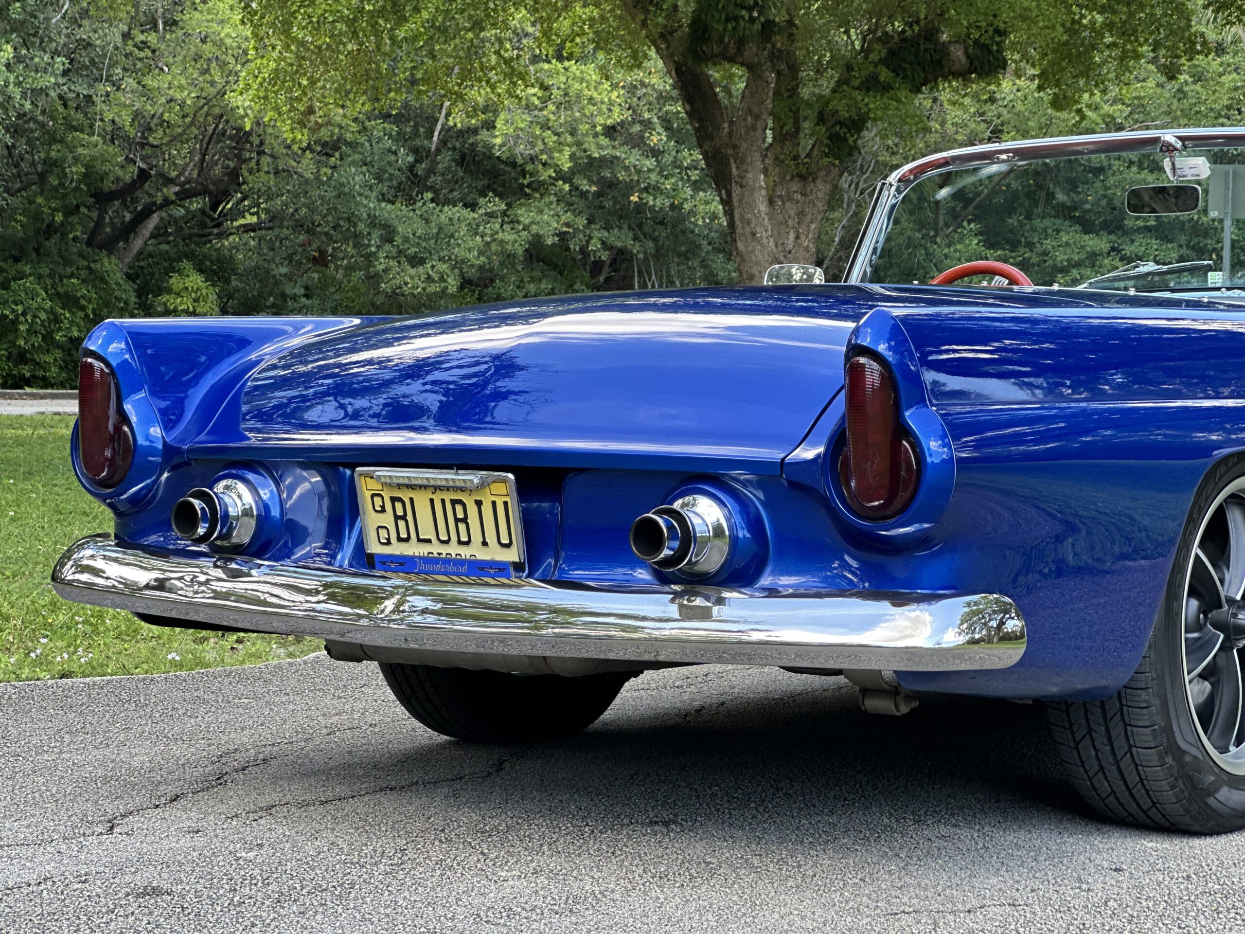 Up for sale is a Beautiful 1955 Ford Thunderbird Restomod! This is a high end show car that went through a 6 year body-off restoration. Powered by a new Blue Print 306CID 400 HP Crate Engine, 5-Speed Manual Transmission and Ford 9 Inch Rear with 3.23 Gears. It has an upgraded and very rare dual quad cross ram intake set up with new Holley 390 cfm 4bbl Carbs. The front end was rebuilt with air ride from air ride technology with self filling tank, new suspension with oversized sway bars, etc, everything is new and replaced. Has vintage air conditioning that blows cold. The electrical system and wiring was all redone. Custom headers with custom exhaust exiting the rear valance. This car sounds, runs and drives excellent with a lot of power. It handles the road great and is perfect for shows or even take it on road course/tracks with excellent handling. The body has been customized with shaved door handles with power openers, custom fitted LED taillights and maserati inspired grille. The body work is laser straight and shows great. Body was disassembled, stripped and epoxy primed prior to paint. The car was finished in House Of Kolor Galaxy Blue Metallic base coat/clear coat. The paint shines great and is ready for shows. The chrome is all in excellent condition, glass and fittings also look great. It has been driven and enjoyed so you may find a small couple touch ups but overall it shows amazing in person. The interior was customized and finished by Richard Trim in Hewitt, NJ. Custom Saddle Leather with suede Interior, seat has been modified for 6 inches of extra cabin room. It has 5-way tilt steering with billet column. The seats are heated, power and has power windows with hidden switches. The car has a Ford Performance clutch, new fuel+brake lines, new electrical system, new fuel tank, custom battery box to hide it in the eng compartment, 3 row aluminum radiator and upgraded cooling system, custom wheels, tires and brakes, much more. Has Ford Tachometer with restored original style gauge cluster. The hardtop was also restored and has a new white canvas soft top. The hardtop has a few minor blemishes in the paint. The engine compartment and trunk are show quality as expected with the rest of the car. Underside is body off restored- frame finished in POR15. This is a very nice, high end car with a ton of money invested. You will get attention and compliments everywhere it goes. It was used in many shows and awards won. It is nicknamed "BlueByU" Comes with photo album made into a book of the restoration start to finish, motor build sheet, dyno sheet, custom floor mats with nickname stitched in, other misc paperwork. Has a clean / clear title.